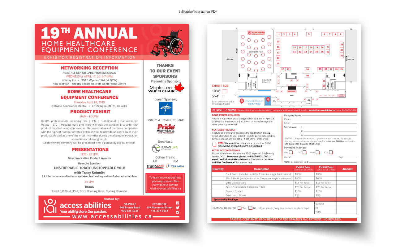 This pdf was created to accommodate the booking and tracking of booth rentals for an exhibition. This streamlined the process and made tracking the availability of booths significantly easier. Custom coding within the pdf calculates the total cost as the user chooses their booth(s) and features.